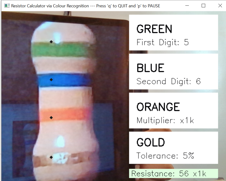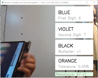 This program determines the resistance of 4-band resistors by recognising the colours and calculating the final value in real-time.